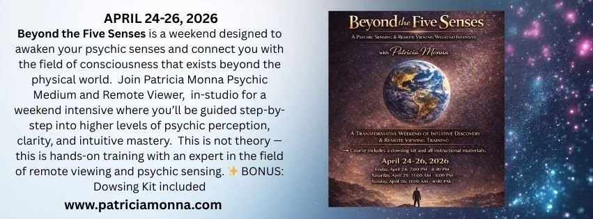 Beyond the Five Senses is a weekend designed to awaken your psychic senses and connect you with the field of consciousness that exists beyond the physical world. Join Patricia Monna Psychic Medium and Remote Viewer, in-studio for a weekend intensive where you’ll be guided step-by-step into higher levels of psychic perception, clarity, and intuitive mastery.